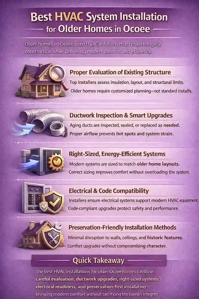 The best HVAC system installation for older Ocoee homes focuses on adapting the system to the house—not forcing the house to fit the system. This guide breaks down what quality installation looks like in older homes, the upgrades that matter most, and how to choose top HVAC system installation near Ocoee FL while avoiding the common mistakes that cause uneven cooling, moisture problems, and rising energy bills.